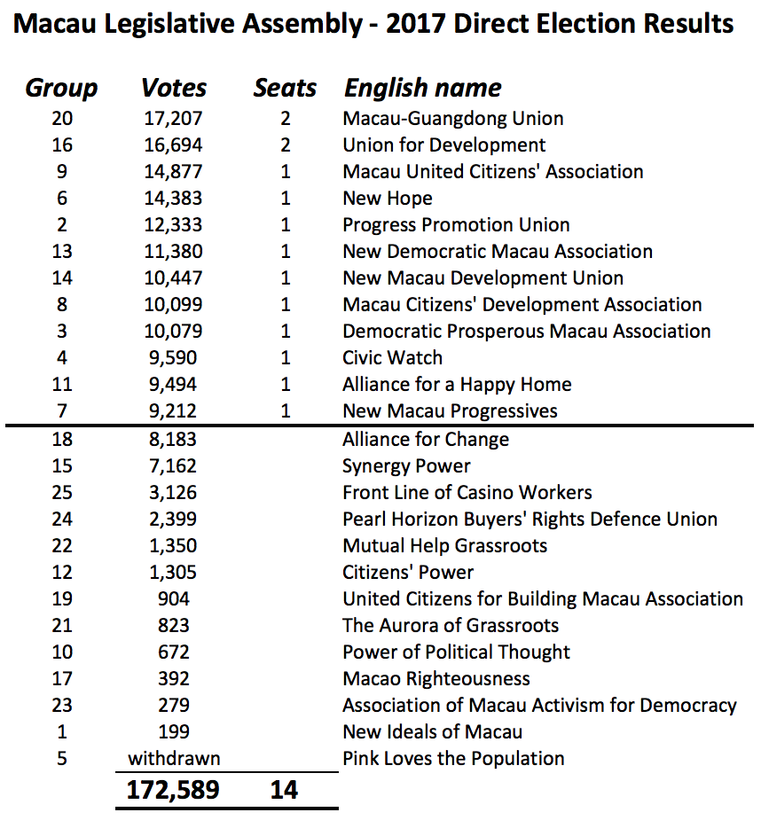 However, the pro-establishment Macau United Citizens Association (ACUM) lost two of its three seats with only Si Ka Lon winning another term. Former ACUM representative Chan Meng Kam – owner of Hotel Golden Dragon, Chairman of City University of Macau and legislator since 2005 – chose not to run.